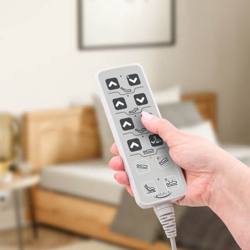 Per un comodo controllo elettronico delle funzioni del letto, il letto di cura IMPULSE è dotato di una comoda e chiara pulsantiera con simboli intuitivi e funzioni di blocco individuali. I pulsanti illuminati con simboli ad alto contrasto consentono di individuare facilmente le funzioni operative anche al buio. Il personale può bloccare singole funzioni o l'intera pulsantiera utilizzando un chip magnetico. Per posizionare il telecomando nell'area di attività del degente, si consiglia il supporto per il portatile con collo d'oca flessibile, disponibile come optional. Il portatile viene fornito di serie con un dispositivo per essere appeso alle guide laterali o ai pannelli laterali.